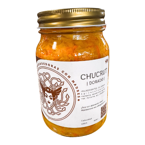 Chucrut Dorado Medusa Fermenta col fermentada artesanal con cúrcuma y jengibre en frasco de vidrioChucrut Dorado